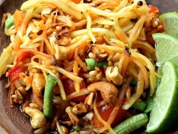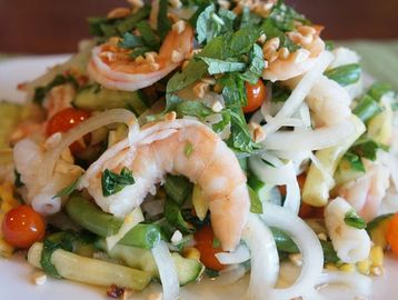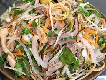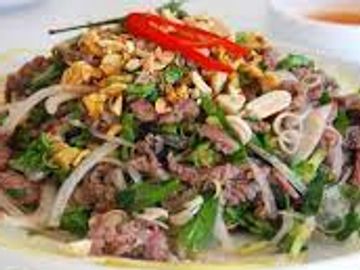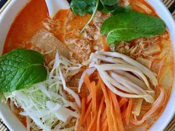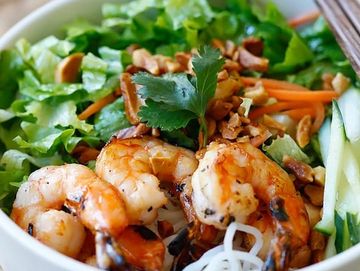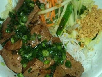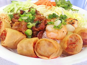 Topping with carrots, cucumber, lettuce, bean sprouts, mints, fried onion, green onions, vermicelli noodles, egg roll & fish cake served with garlic lemon fish sauce.