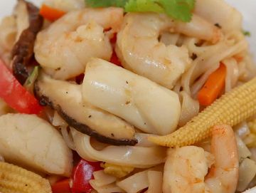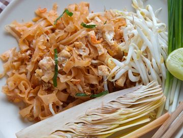 Stir-fried rice noodles with egg, green onions & bean sprouts topping with ground peanut.