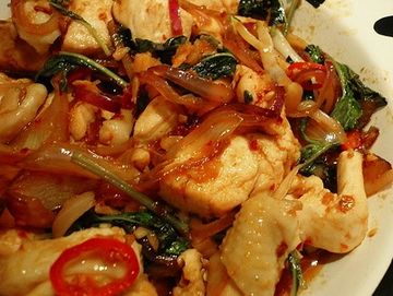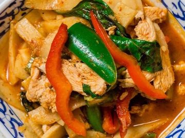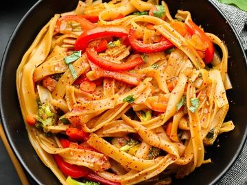 Stir-fried flat noodles with egg, broccoli, bell peppers, jalapeno, chili & basil leaves.