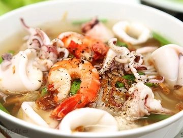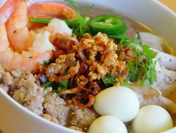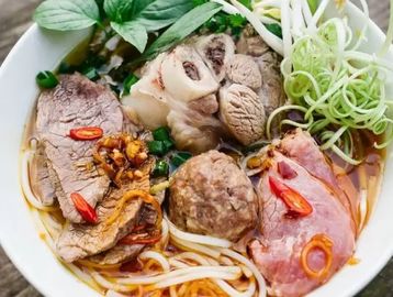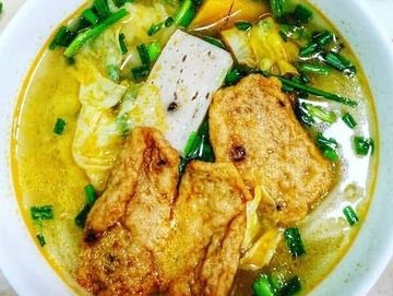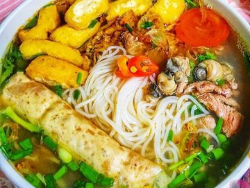 Topped with carrots, cucumber, lettuce, bean sprouts, mints, fried onion, green onions, vermicelli noodles, egg roll & fish cake served with garlic lemon fish sauce.